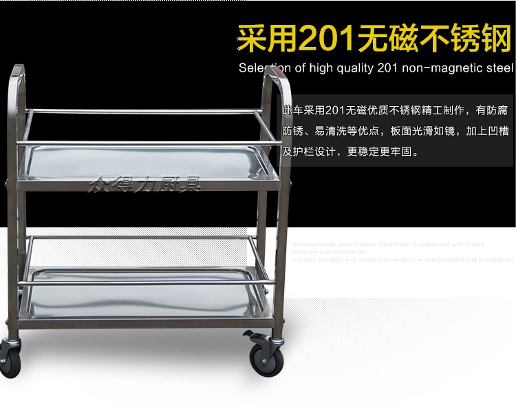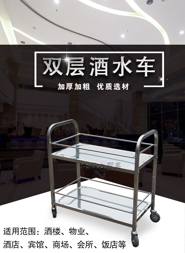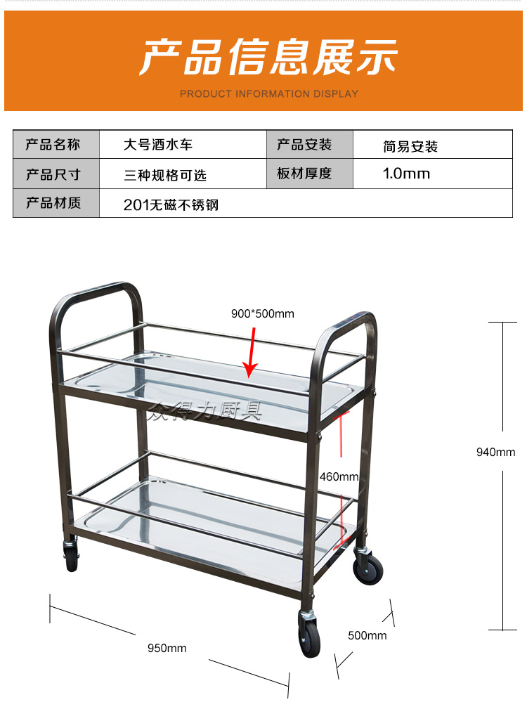 江西眾得力廚具有限公司生產(chǎn)銷售食品機械,商用廚具系列中央廚房設(shè)備,為客戶提供廚房整體解決方案。我司生產(chǎn)銷售的酒水車有大、中、小三種規(guī)格,采用201無磁不銹鋼設(shè)計。外形美觀大方,結(jié)實耐用。深受餐飲酒店客戶青睞