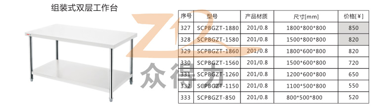 江西眾得力廚具有限公司為您提供中央廚房一站式服務,生產銷售食品機械、商用廚具。本組裝式工作臺有1800型和1500型兩種型號,寬度規(guī)格有800mm和600mm可選,板材用料扎實,經久耐用。