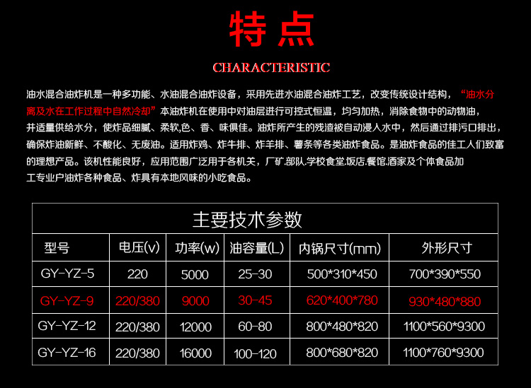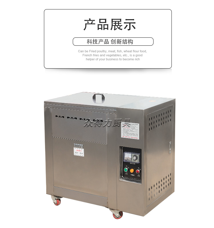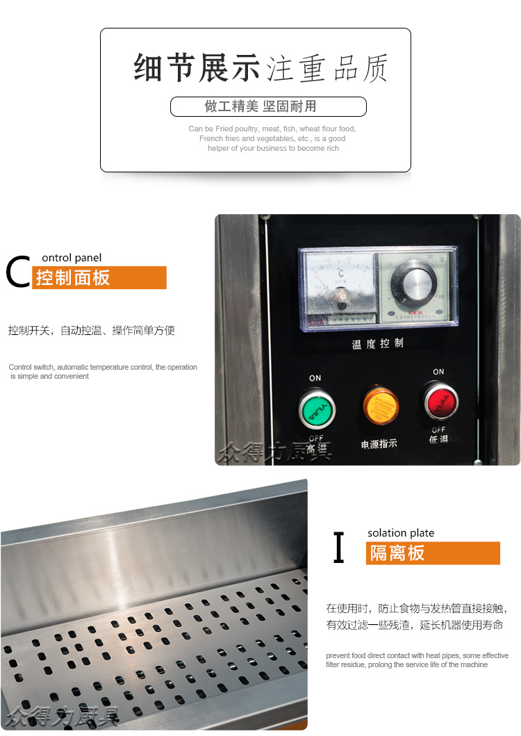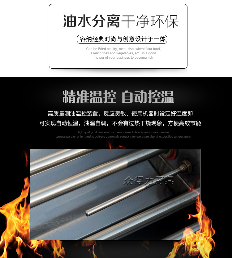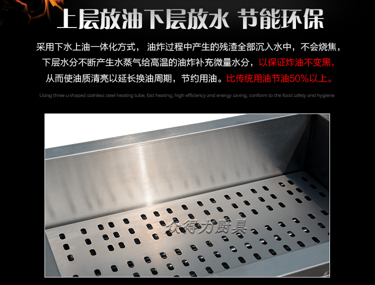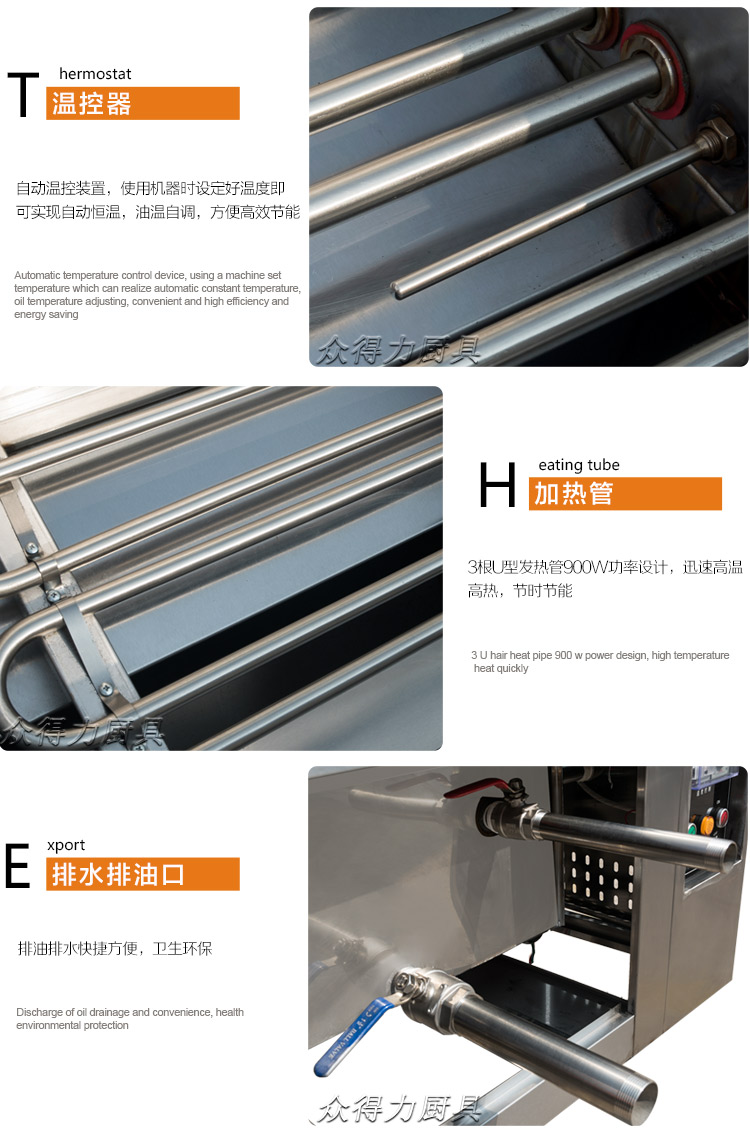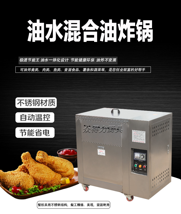 眾得力旗下產(chǎn)品油炸系列,不銹鋼電熱節(jié)能油水分離油炸爐,油炸機(jī),YZ系列油炸爐,電加熱,節(jié)能油水分離油炸一體爐,油水過濾,確保油炸物能100%油炸,殘留物通過水過濾,拒絕一直油炸。油炸不變黑,炸出來的食品外形美觀