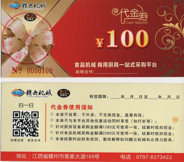 我司聯(lián)合贛云機械發(fā)起廚具與食品機械聯(lián)合采購抵扣卷,本次活動真實有效,廚具類設(shè)備采購滿1280元即可使用該卷抵扣現(xiàn)金100元,食品機械類設(shè)備采購金額滿2580元即可抵扣現(xiàn)金100元。